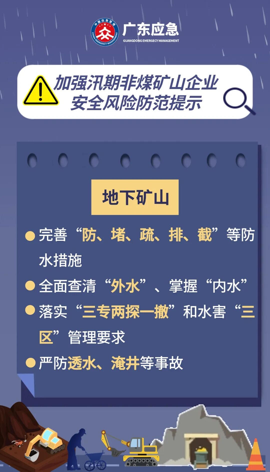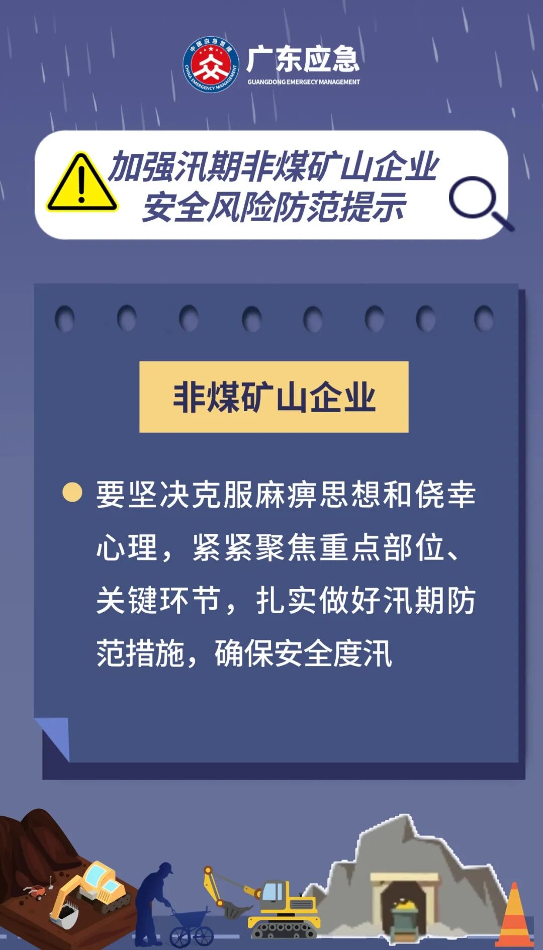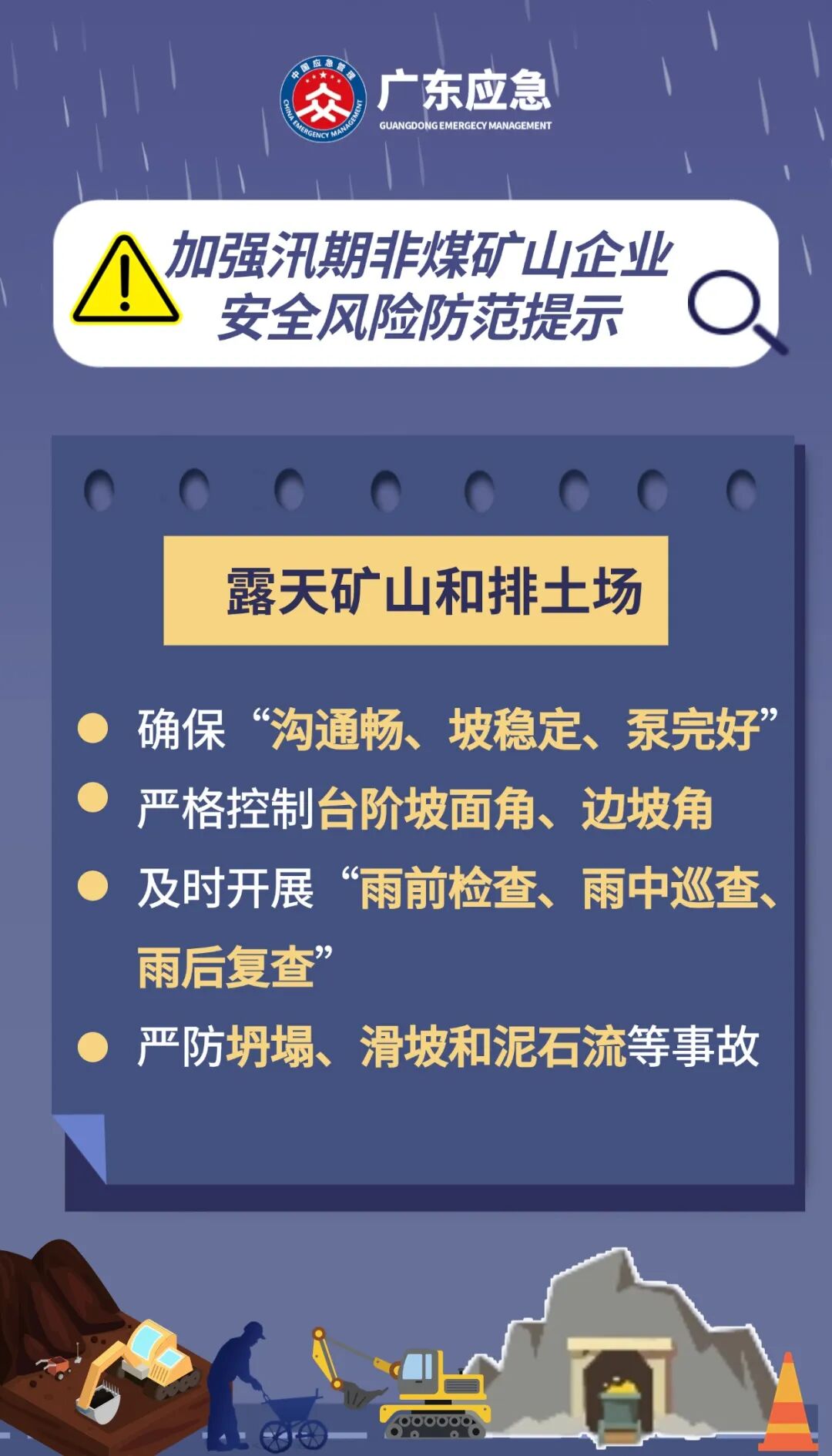平均气温大部略偏高,其中粤北偏高0.3~0.8℃,其余地区偏高0.1~0.5℃。月平均最高气温略偏高0.1~0.5℃。 月内有4次主要的降水过程,大致出现在:3-5日(大到暴雨, 局部大暴雨)、12-13日(中雷雨,局部暴雨)、17-19日(大雨,局部暴 雨或大暴雨)、26-31日(大到暴雨,局部大暴雨或特大暴雨)。 月内有3次高温天气,大致出现在:7-10日、15-16日、22-24日。 月内可能有2个热带气旋登陆或严重影响我省,可能出现在8月中旬后期和8月底至9月初。 非煤矿山 存在点多、面广、线长的特点 水文地质条件复杂 抗灾能力弱 当前正值“七下八上”的防汛关键期 高温多雨天气多变 雷雨、大风、等强对流天气频发 安全风险增加 这份安全提示请收好 ↓↓↓ 综合自:应急管理部、广东天气